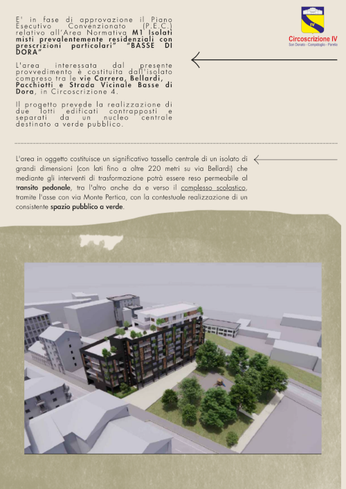 E' in fase di approvazione il Piano Esecutivo Convenzionato (P.E.C.) relativo all'Area Normativa M1 Isolati misti prevalentemente residenziali con prescrizioni particolari" "BASSE DI DORA"