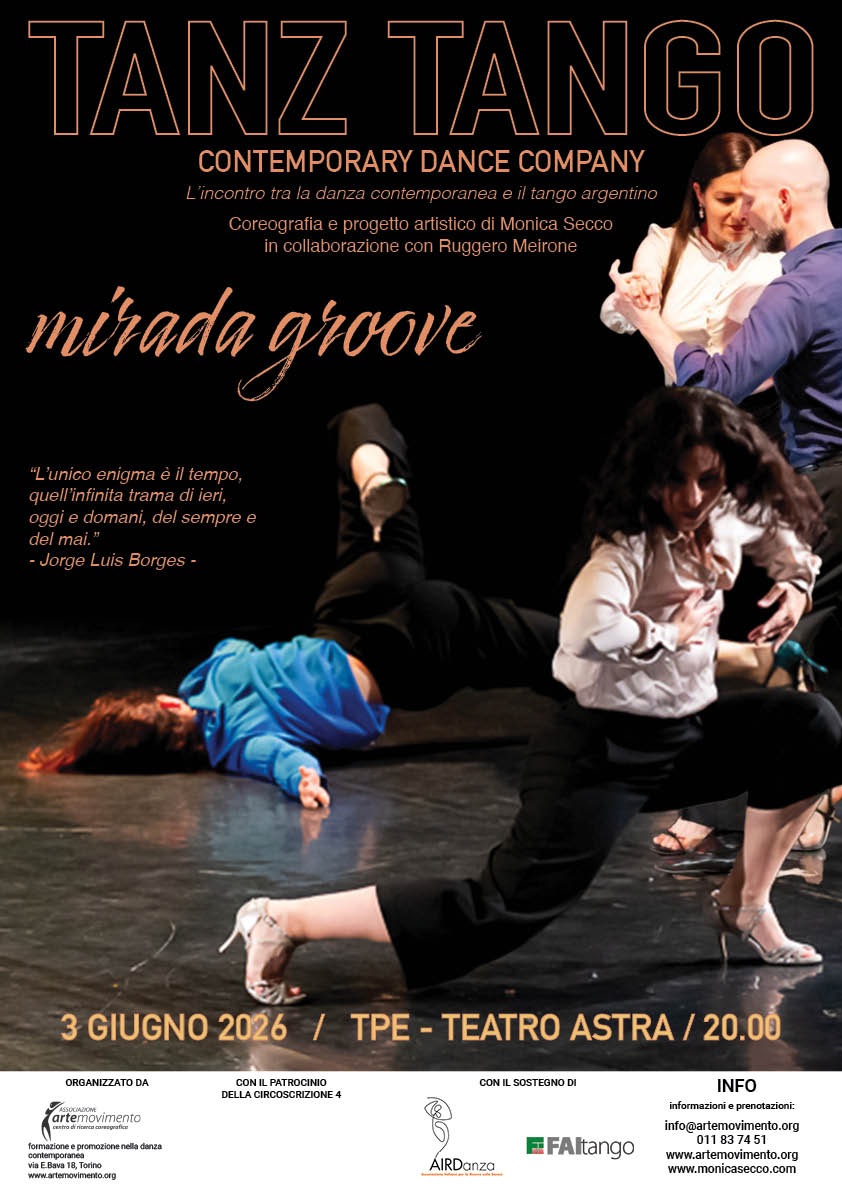 Teatro Evento organizzato all’interno del progetto Tanz TangoTanz tango - contemporary dance companyQuando03 Giugno 2026 dalle 20:00 alle 21:00Indice della paginaDate03 Giugno 2026, 20:00 - 21:00DescrizioneUn incontro tra la danza contemporanea e il tango argentino con uno spettacolo al Teatro AstraCoreografia e progetto artistico Monica SeccoImmaginilocandinaDoveTeatro Astra Via Rosolino Pilo, 6TorinoTOItaliaContattiTelARTEMOVIMENTO011 837451Ultima modifica11 Marzo 2026