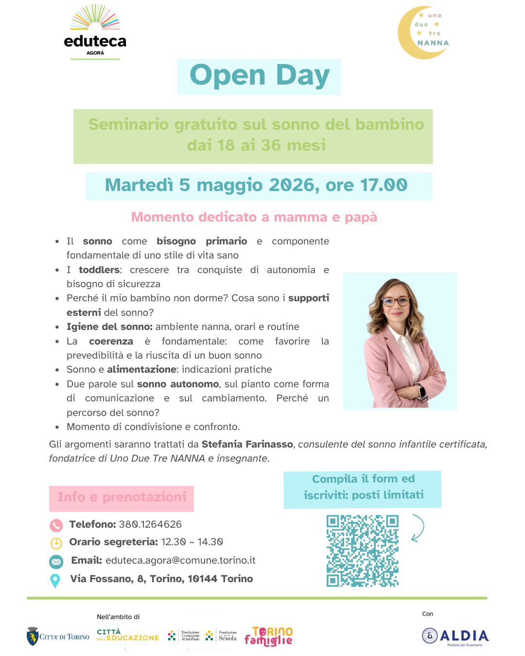 Gli argomenti saranno trattati da Stefania Farinasso, consulente del sonno infantile certificata, fondatrice di Uno Due Tre NANNA e insegnante.