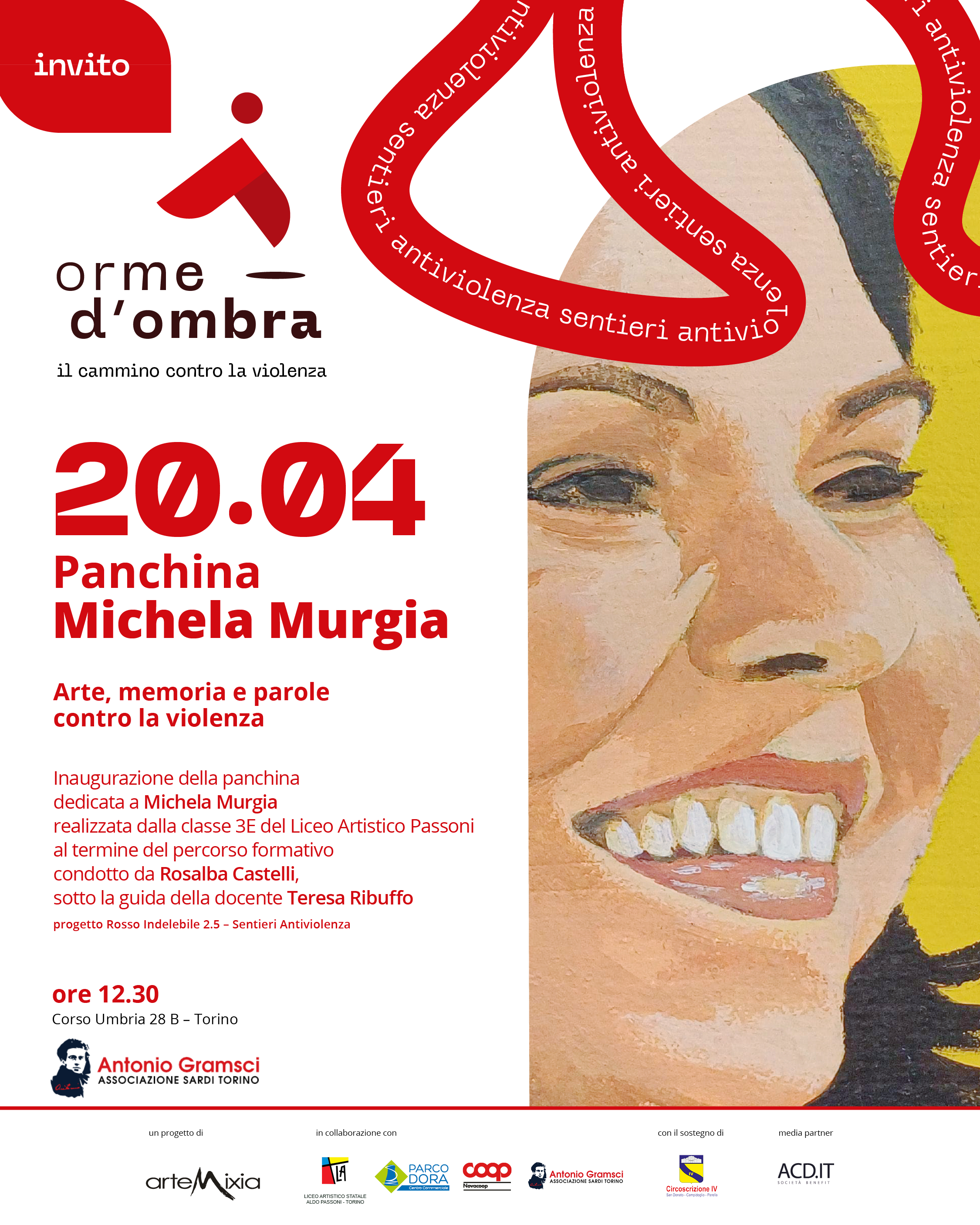 L’iniziativa è promossa da Artemixia APS ETS, in collaborazione con l’Associazione dei Sardi “Antonio Gramsci”, di fronte alla cui sede la panchina è collocata, e con le realtà del territorio, con il sostegno della Circoscrizione 4 della Città di Torino. Fa parte del progetto Rosso Indelebile 2.5 – Sentieri antiviolenza, come prosecuzione del cammino Orme d’ombra, che continua a generare azioni pubbliche, educative e simboliche nei territori.