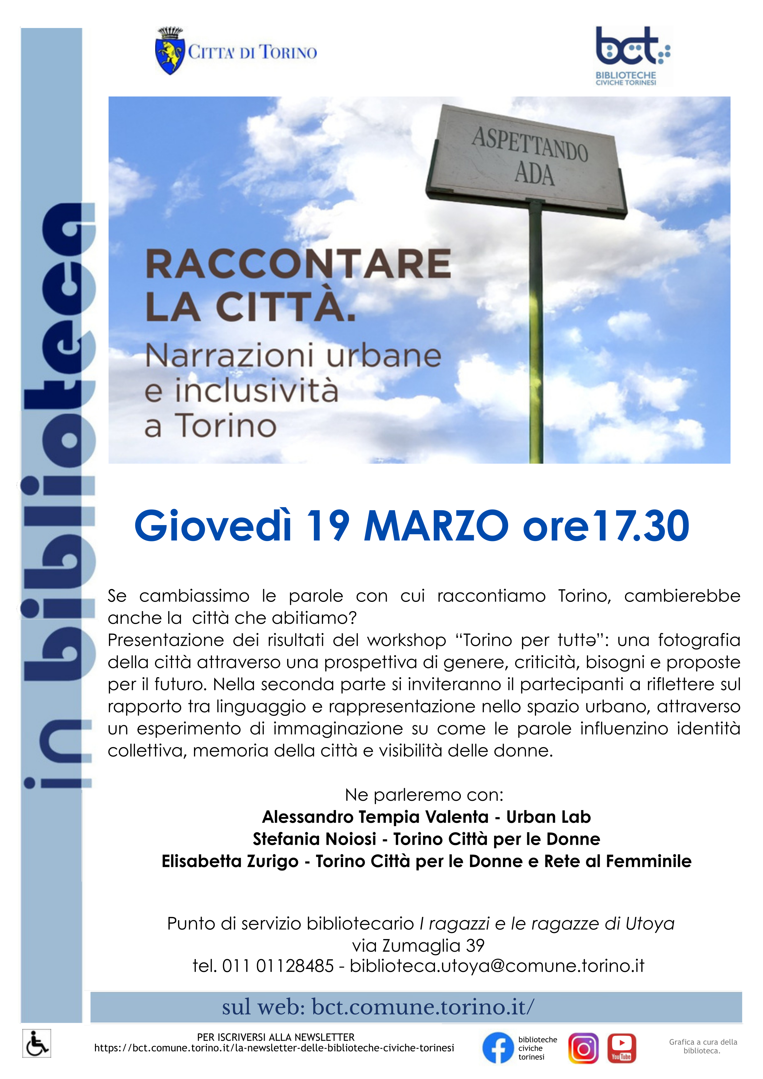 Ne parleremo con: Alessandro Tempia Valenta - Urban Lab Stefania Noiosi - Torino Città per le Donne Elisabetta Zurigo - Torino Città per le Donne e Rete al Femminile
