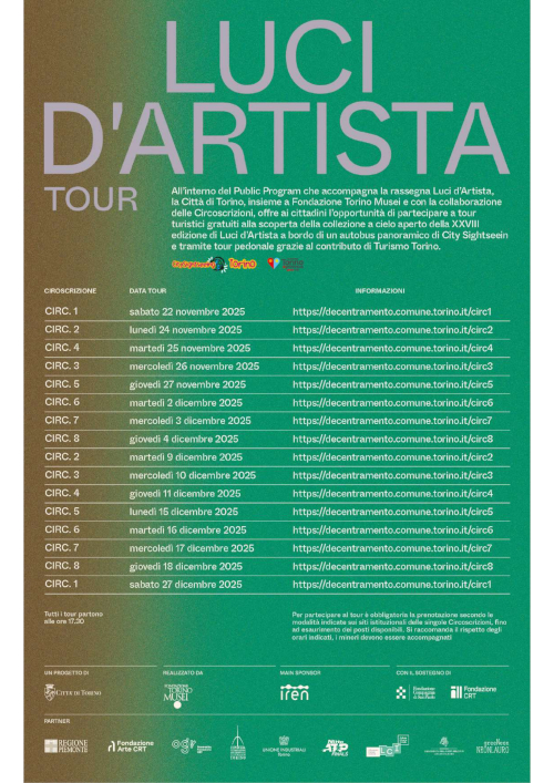 La Città di Torino, insieme a Fondazione Torino Musei e con la collaborazione delle Circoscrizioni, offre ai cittadini l'opportunità di partecipare a tour gratuiti alla scoperta della XXVIII edizione di Luci d'Artista a bordo di un autobus panoramico di CitySightSeeing Torino.
