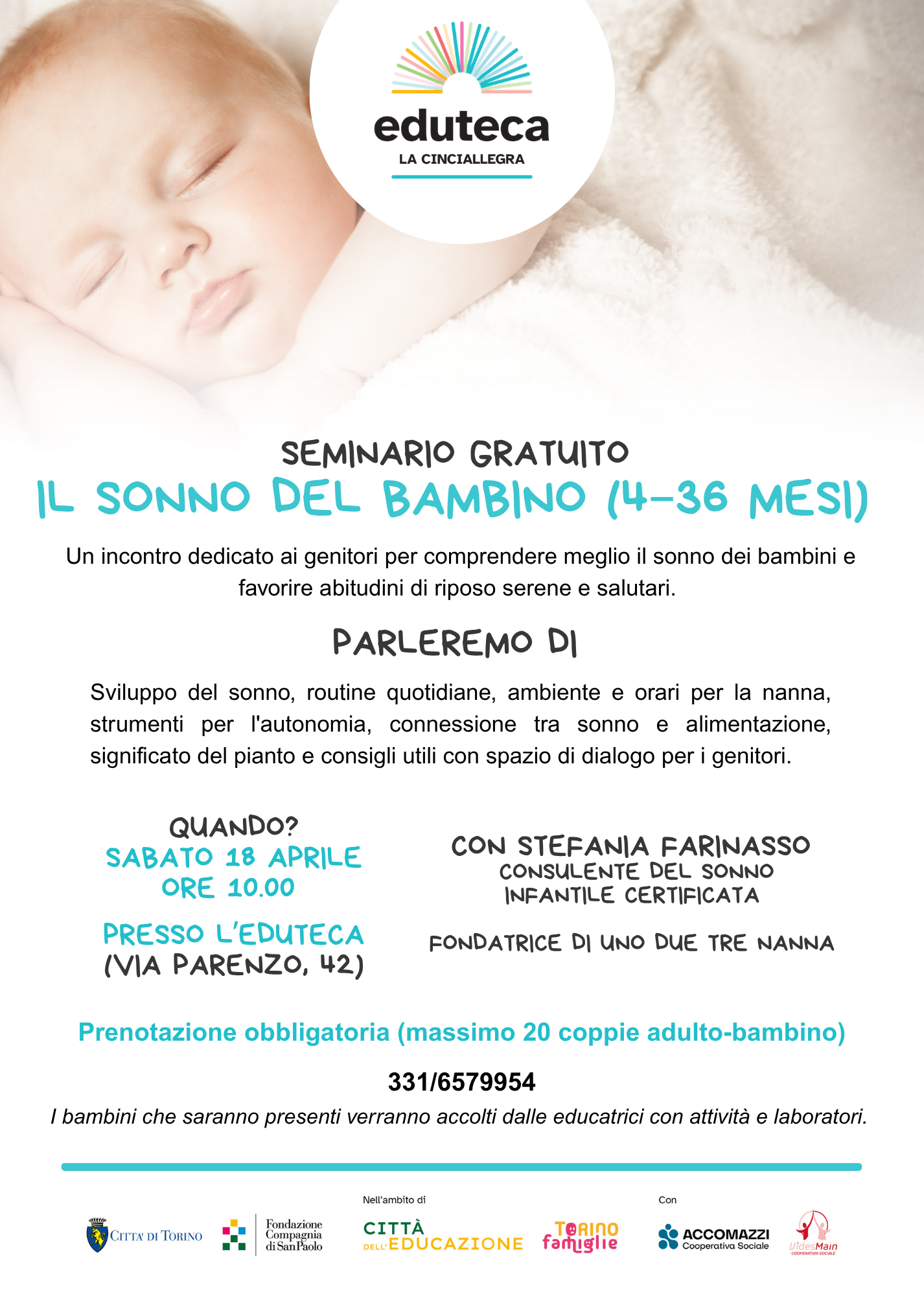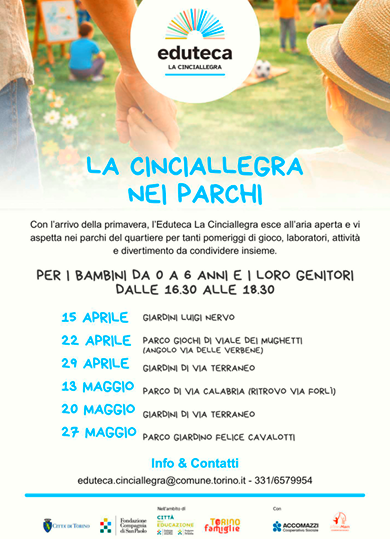 Tipo di notiziaNotiziaEduteca la Cinciallegra di via Parenzo, 42 - Terapia del sonno il 18 aprile 2026 e, La Cinciallegra nei parchi dal 15 aprile al 27 maggio 2026.Data della notizia15 Aprile 2026Indice della paginaDescrizioneLa terapia del sonno per bambini da 4 a 36 mesi:Sabato 18 aprile 2026 presso La Cinciallegra in via Parenzo, 42. La Cinciallegra nei parchi: tutti i mercoledì dalle ore 16:30 alle ore 18:3015 aprile: giardino Luigi Nervo;22 aprile: parco giochi di viale Dei Mughetti angolo via Della Verbene;29 aprile: giardino di via Terraneo;13 maggio: parco di via Calabria angolo via Forlì;20 maggio: giardino via Terraneo;27 maggio: parco giardino Felice Cavallotti.Info e contatti:posta elettronica: eduteca.cinciallegra@torino.ittelefono: 331 6579954 Immaginiimmagine di bambino che dormeBambini nel parcoDocumentiEduteca La Cinciallegra_Terapia.pdf (997.46 KB)Eduteca La Cinciallegra nei parchi.pdf (203.62 KB)Ultima modifica16 Aprile 2026