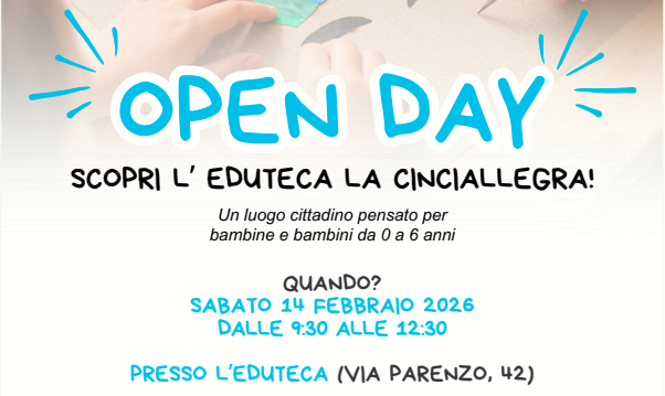 Sabato 14 febbraio 2026 l’Eduteca La Cinciallegra aprirà le porte per un nuovo Open Day: dalle 9:30 alle 12:30 i bambini e i ragazzi del territorio, insieme con le loro famiglie, potranno scoprire gli spazi e partecipare a laboratori creativi, letture e tantissimi giochi.