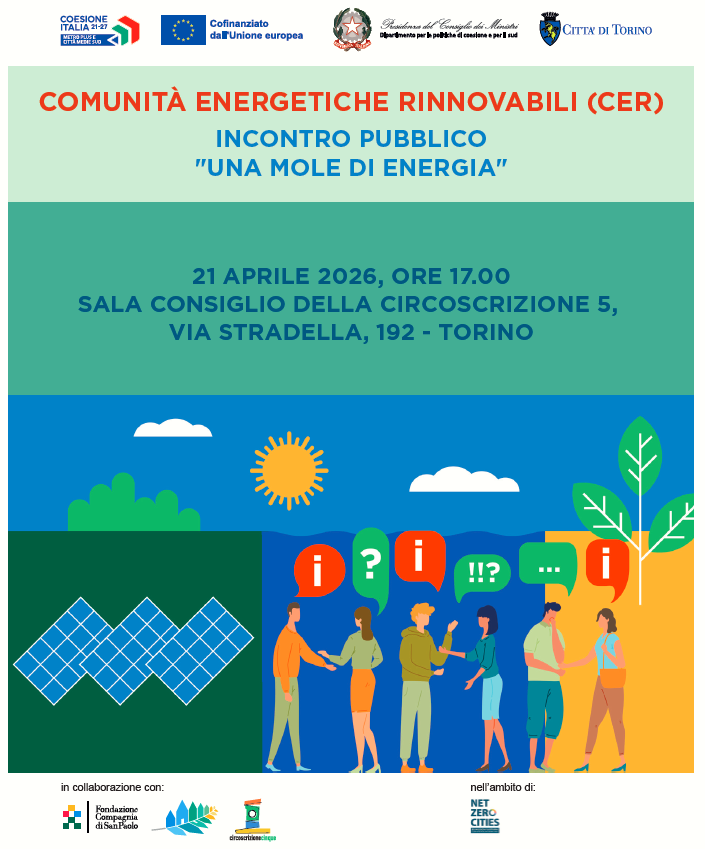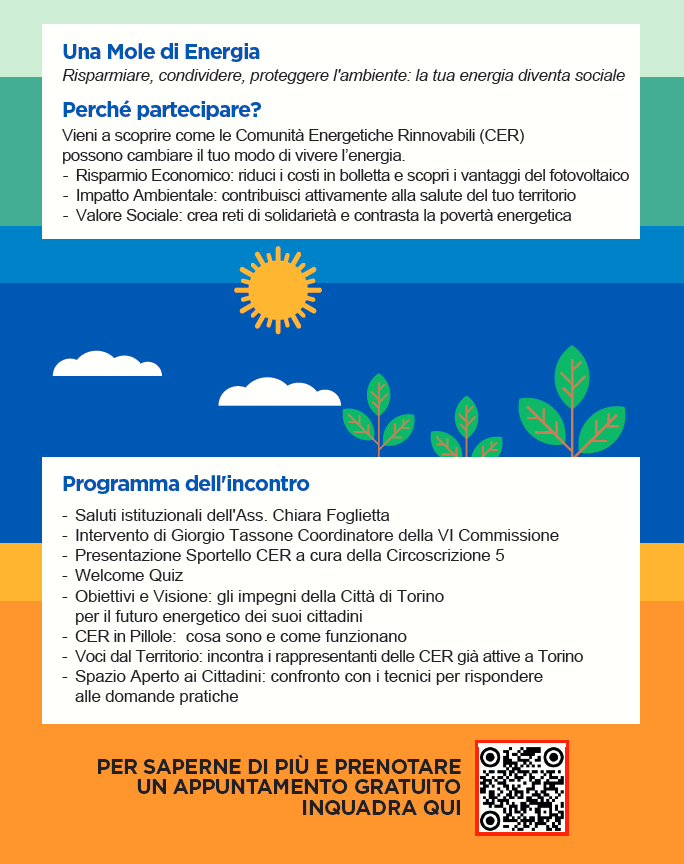 Una Mole Di Energia: Incontro Pubblico Comunità Energie Rinnovabili (CER) è rivolto a tutti i cittadini, martedì 21 aprile 2026 alle ore 17:00 presso la Sala Consiglio del Centro Civico.