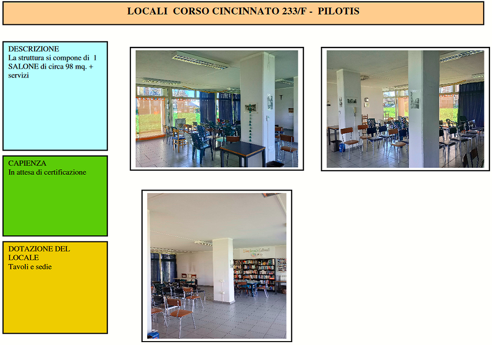 Si trova in corso Cincinnato 115/B, ha una superficie complessiva di circa 140 mq., è costituita da n.1 locale di ingresso di 23 mq., 1 salone di circa 84 mq., 1 saletta di circa 18 mq. ed un blocco servizi igienici di circa 14 mq.
