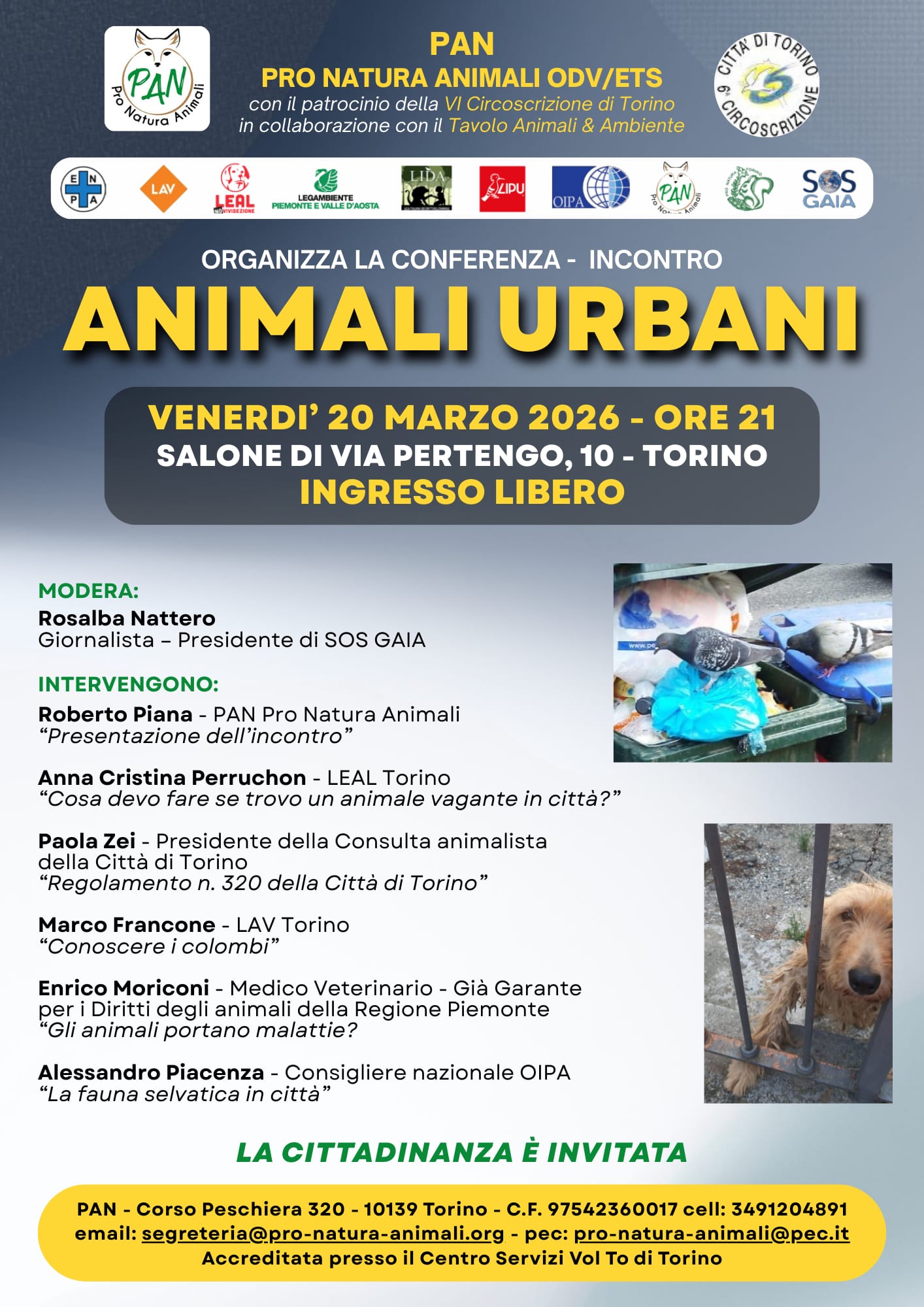 Venerdì 20 marzo 2026 alle ore 21.00 l’organizzazione PAN ospita un incontro aperto a tutti dedicato alla convivenza tra cittadini e animali negli spazi urbani. Un momento di informazione, confronto e sensibilizzazione.