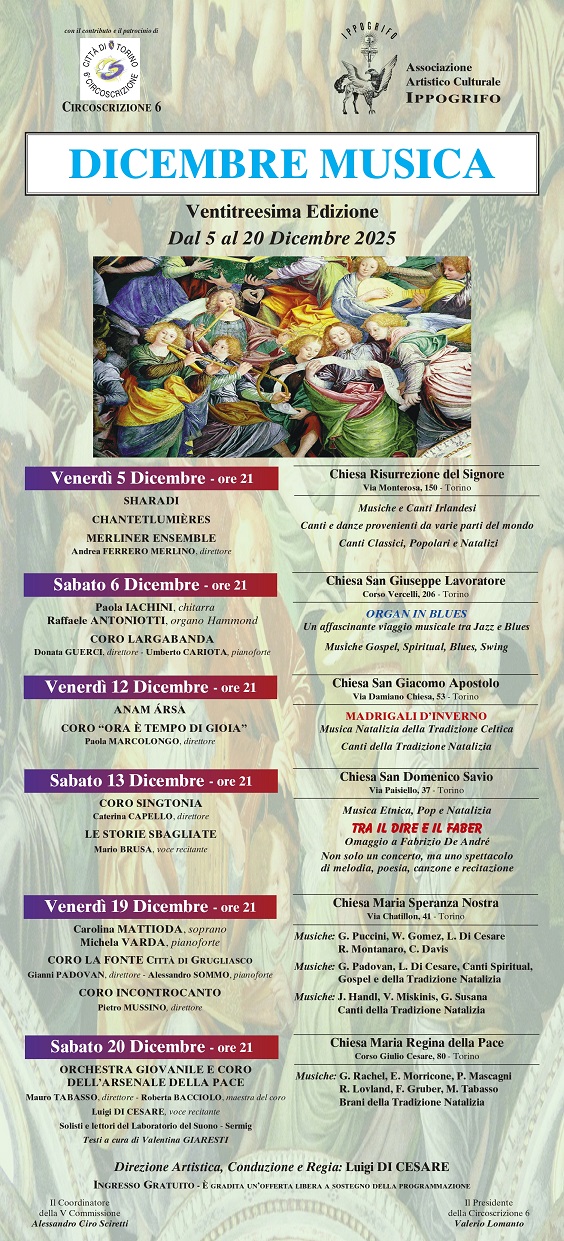 L'Associazione Artistico Culturale Ippogrifo presenta la 23ª edizione di "Dicembre in Musica", un viaggio tra note e emozioni che accompagnerà le festività. Dal 5 al 20 dicembre, concerti e appuntamenti musicali animeranno il territorio, regalando momenti di bellezza e condivisione per grandi e piccoli.