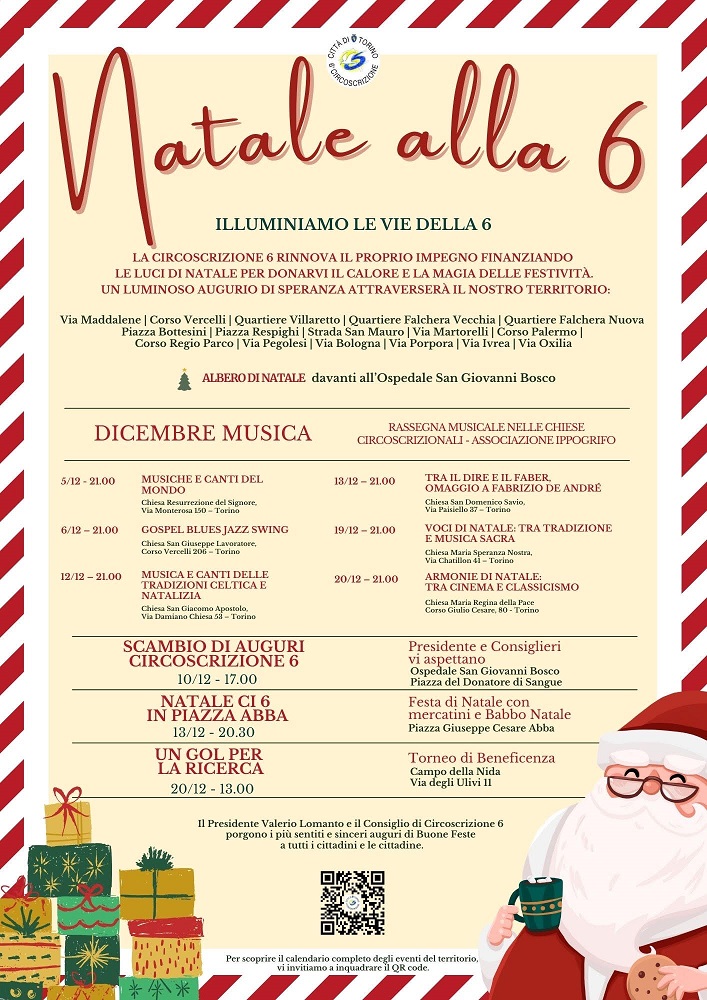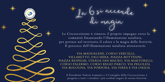 La Circoscrizione 6 è lieta di presentare il programma degli eventi natalizi 2025, un'occasione speciale per vivere le feste in un clima di comunità, tradizione e autentico calore. Le iniziative proposte offriranno momenti di condivisione, cultura e partecipazione, trasformando il territorio della 6 in uno spazio accogliente, animato da luci, emozioni e vero spirito natalizio.