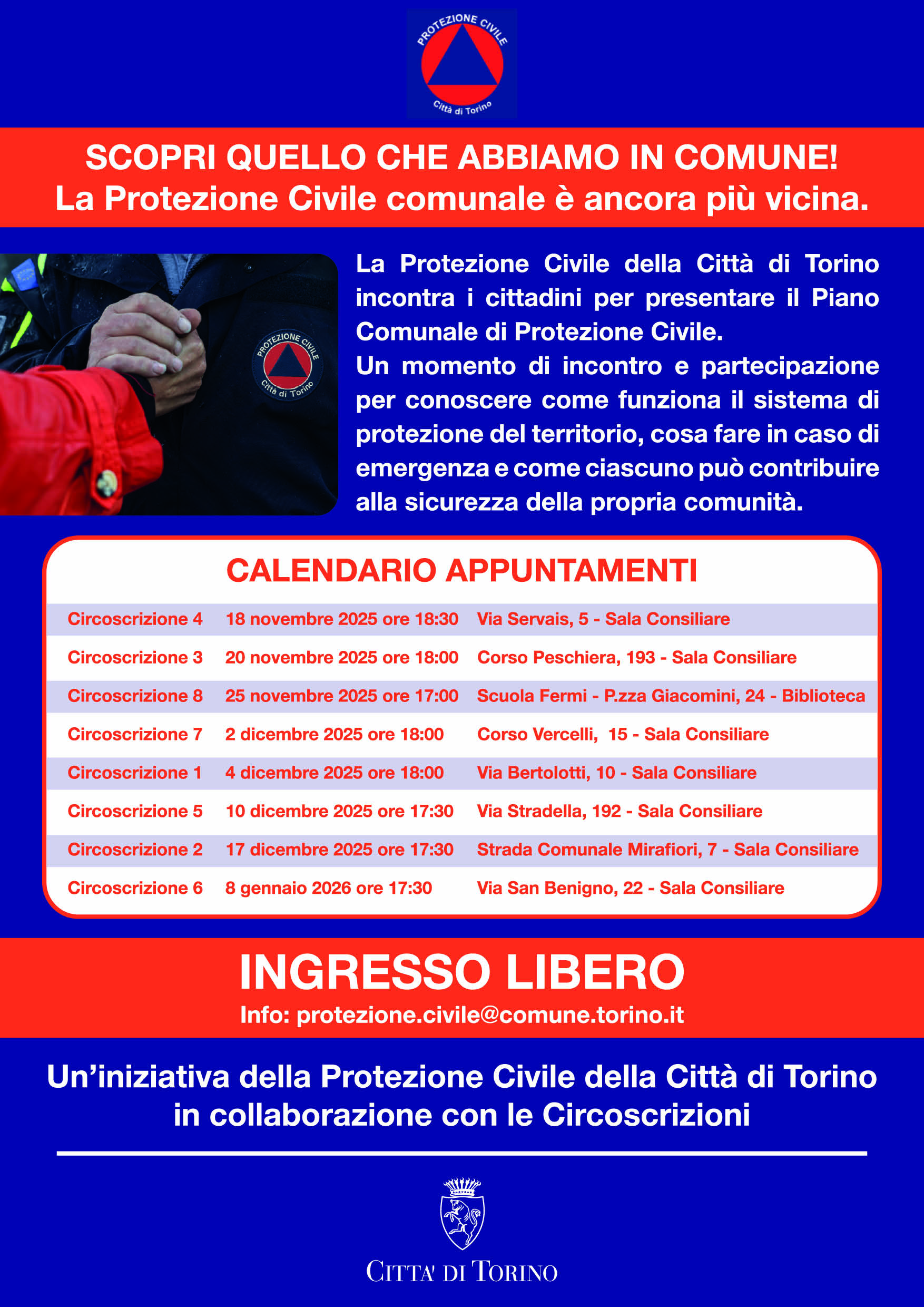 La Protezione Civile della Città di Torino promuove una serie di incontri pubblici nelle Circoscrizioni, dedicati alla presentazione del Piano Comunale di Protezione Civile.