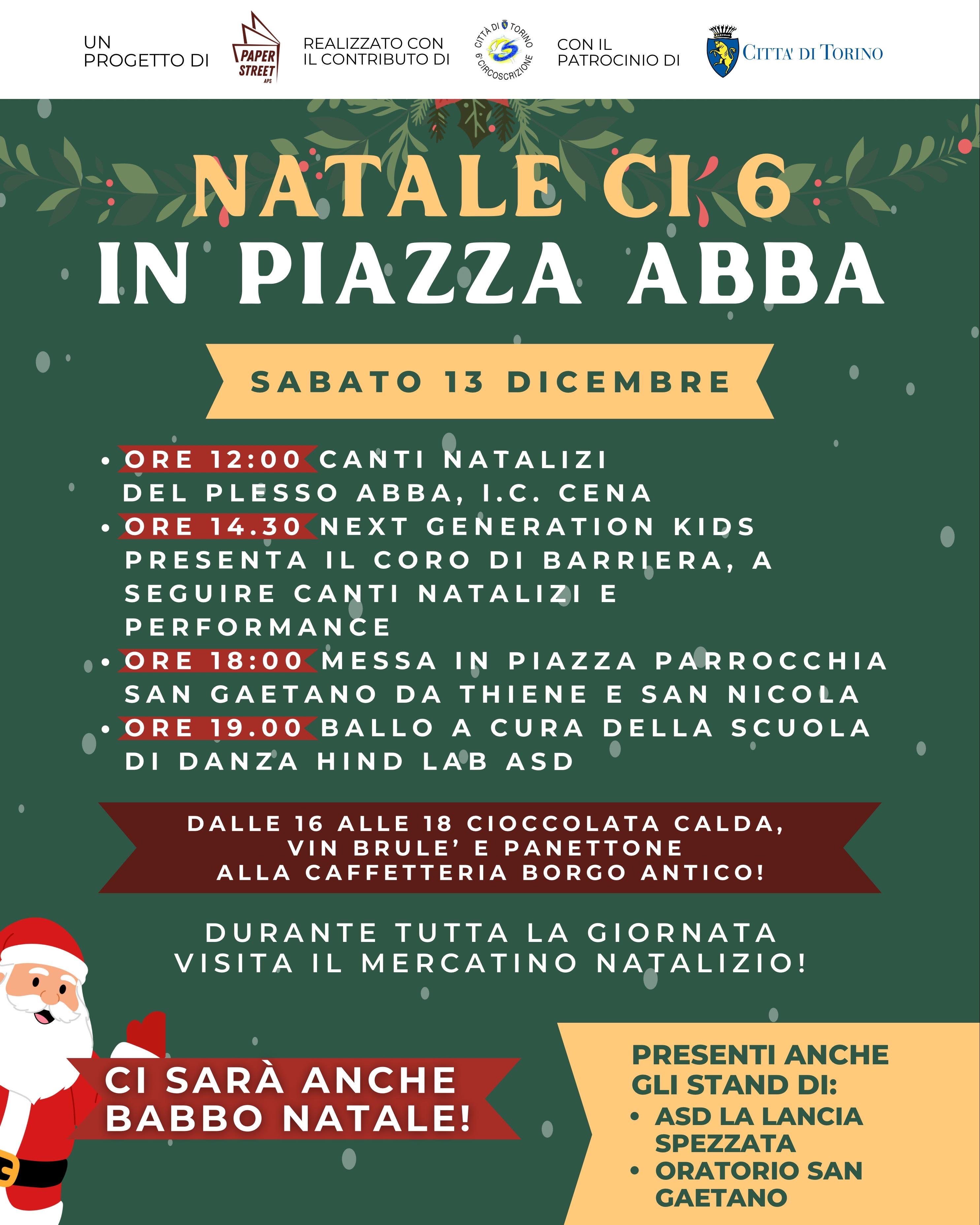 Quest’anno Piazza Abba ospita Natale ci 6, una giornata speciale organizzata con il contributo della Circoscrizione 6 e dedicata a tutta la comunità, con musica, spettacoli, dolci e tante sorprese natalizie. Un’occasione per vivere insieme l’atmosfera del Natale, tra cori, mercatini e momenti di festa. Ti aspettiamo il 13 dicembre!