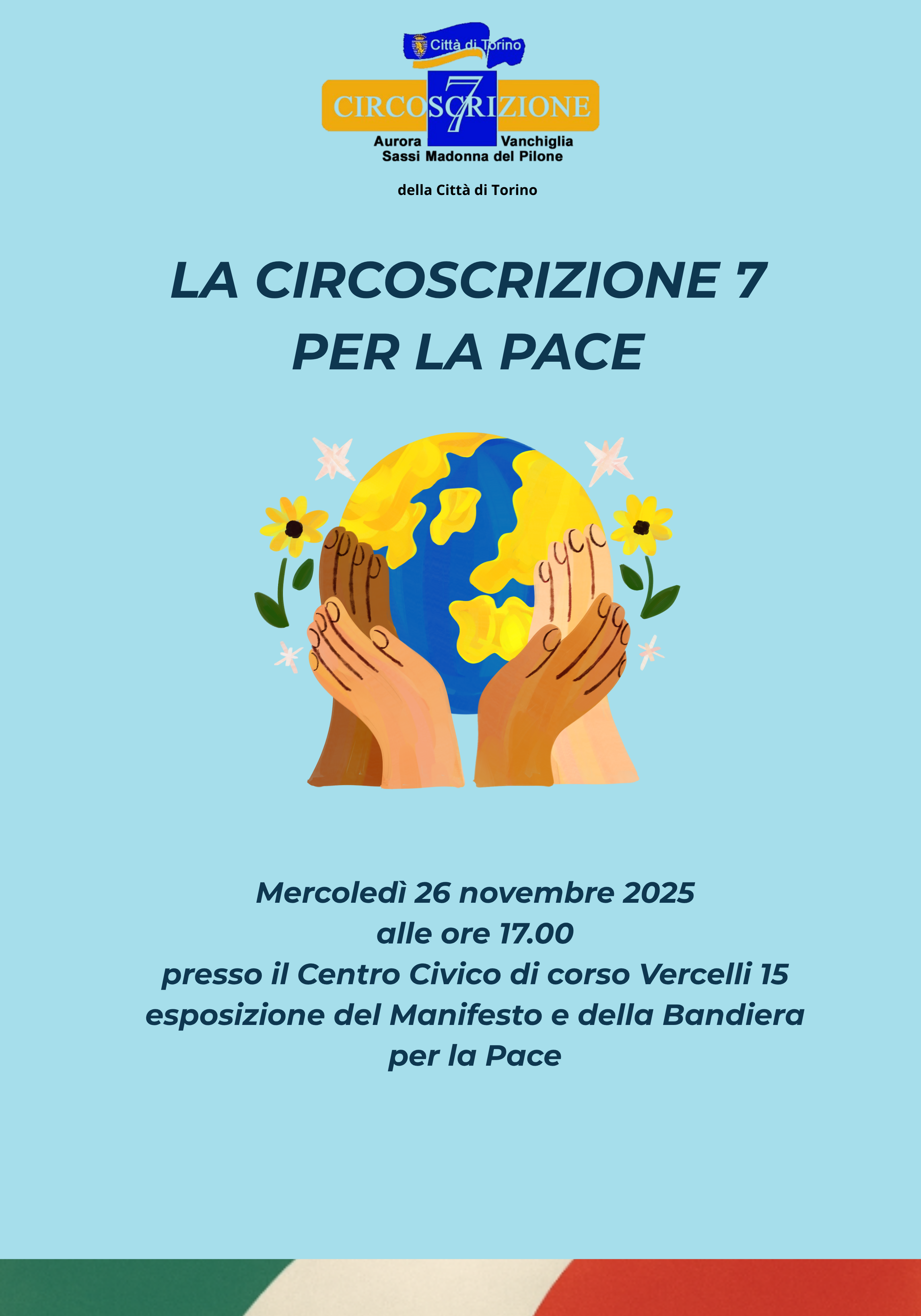 A seguito dell'Ordine del Giorno presentato dal Consigliere Francesco Lauria del Movimento 5 stelle, approvato in sede di Consiglio nelle scorse settimane, la Circoscrizione 7 ha predisposto la realizzazione di n. 3 manifesti a favore della Pace, che verranno affissi, insieme alla Bandiera, nel Centro Civico di corso Vercelli e presso i Centri d'Incontri di corso Belgio e corso Casale.
