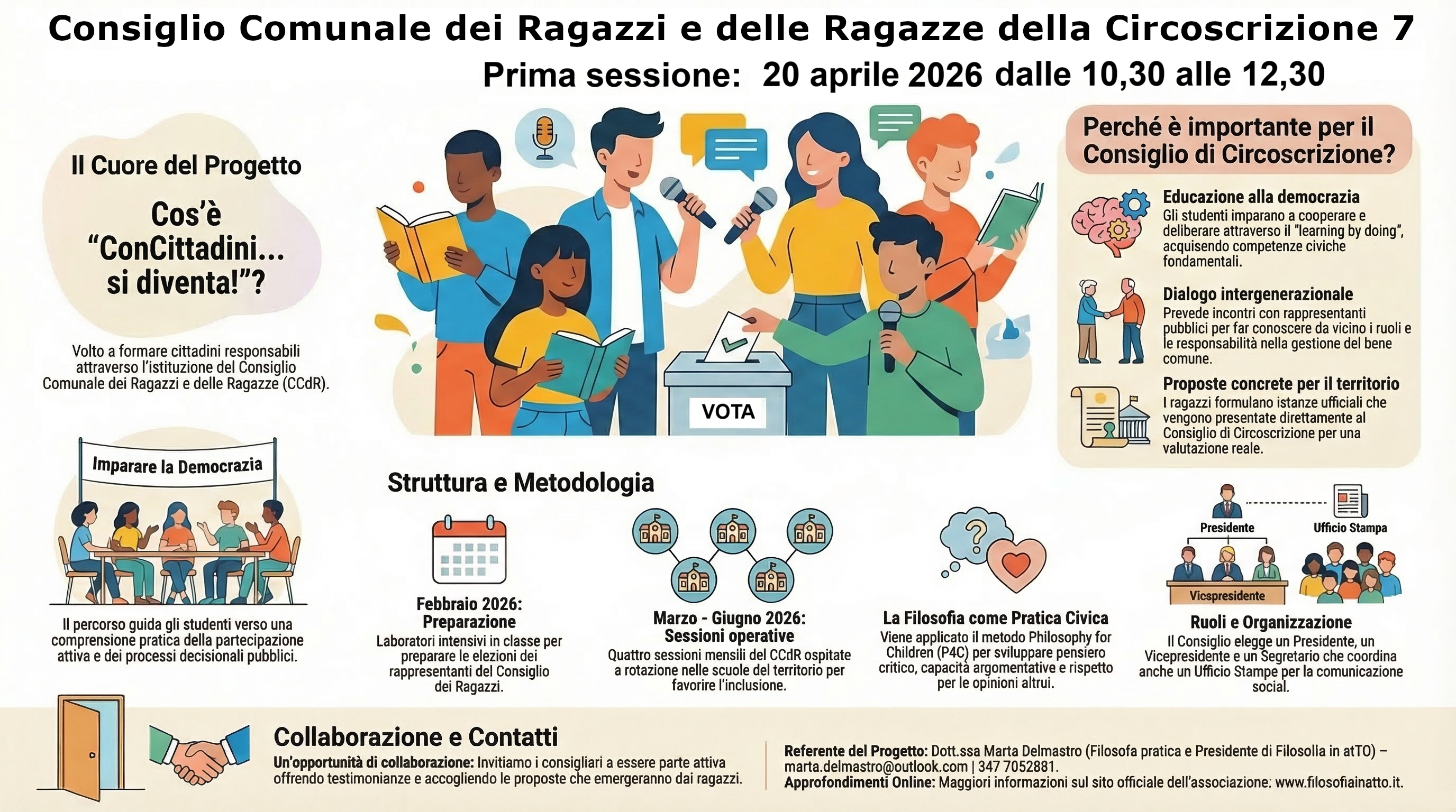 Lunedì 20 aprile 2026, dalle 10:30 alle 12:30, prende il via il Consiglio Comunale dei Ragazzi e delle Ragazze della Circoscrizione 7, un progetto che promuove la partecipazione attiva dei giovani alla vita democratica.