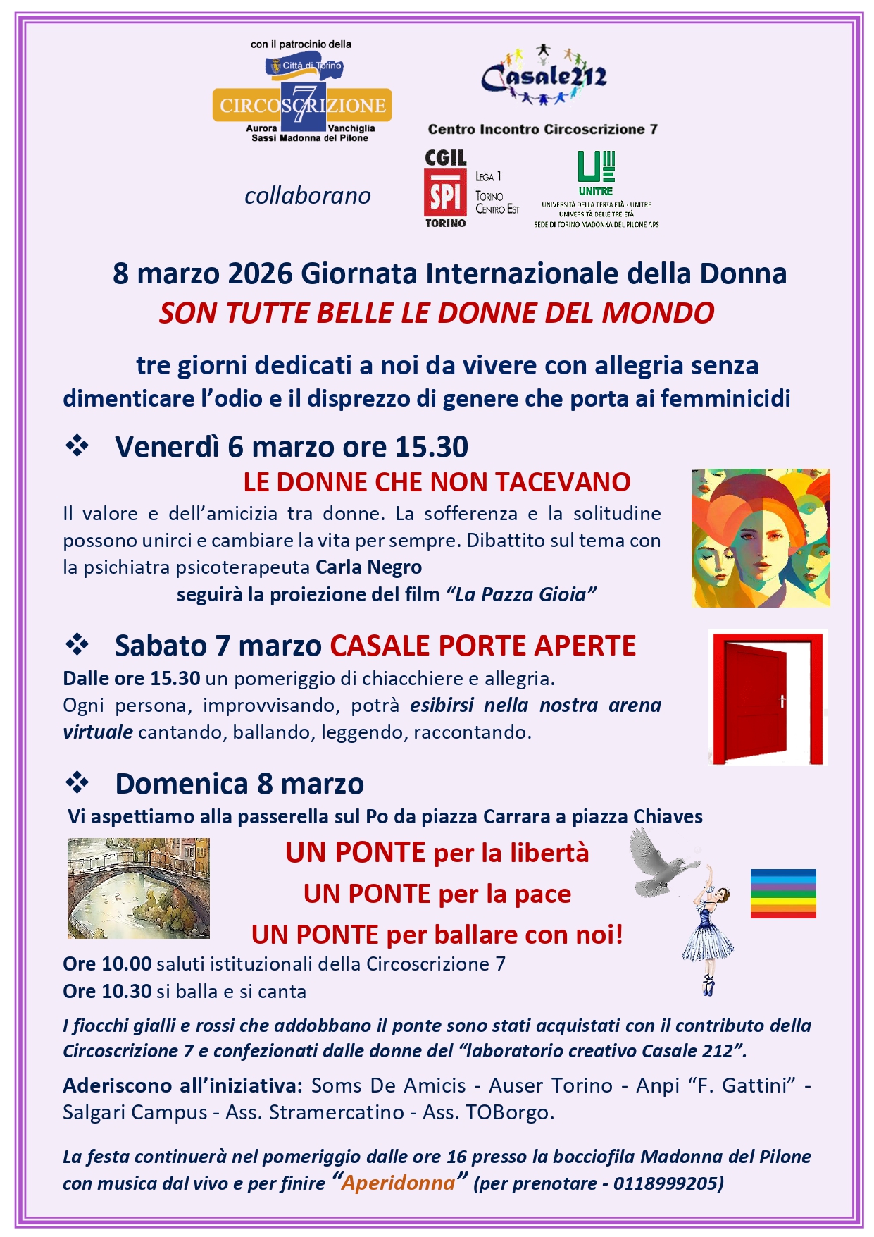 Tipo di notiziaNotiziaIl Centro d'Incontro di corso Casale, 212 ha organizzato tre giornate dedicate alla Giornata Internazionale della Donna.Data della notizia05 Marzo 2026Indice della paginaDescrizioneIn occasione della Giornata Internazionale della Donna, il Centro d'Incontro di corso Casale, 212 ha organizzato tre giornate dedicate all'8 marzo:venerdì 6 marzo ore 15:30: "Le Donne che non tacevano"sabato 7 marzo ore 15:30: "Casale a porte aperte"domenica 8 marzo ore: 10:00: "Un ponte per la libertà, un ponte per la pace, un ponte per ballare con noi"Per maggiori informazioni consulta la locandina.Iniziativa patrocinata dalla Circoscrizione 7. ImmaginiCasale 8 marzoUltima modifica5 Marzo 2026
