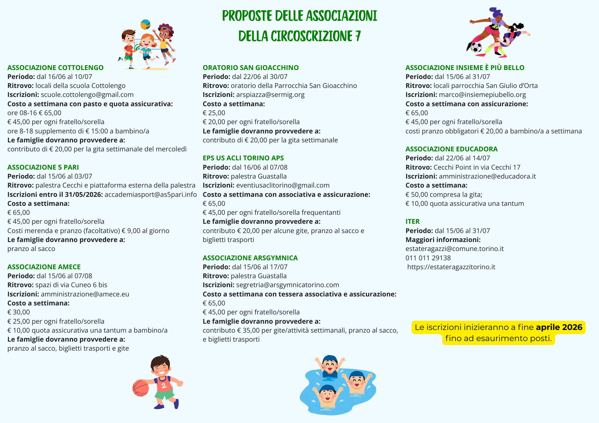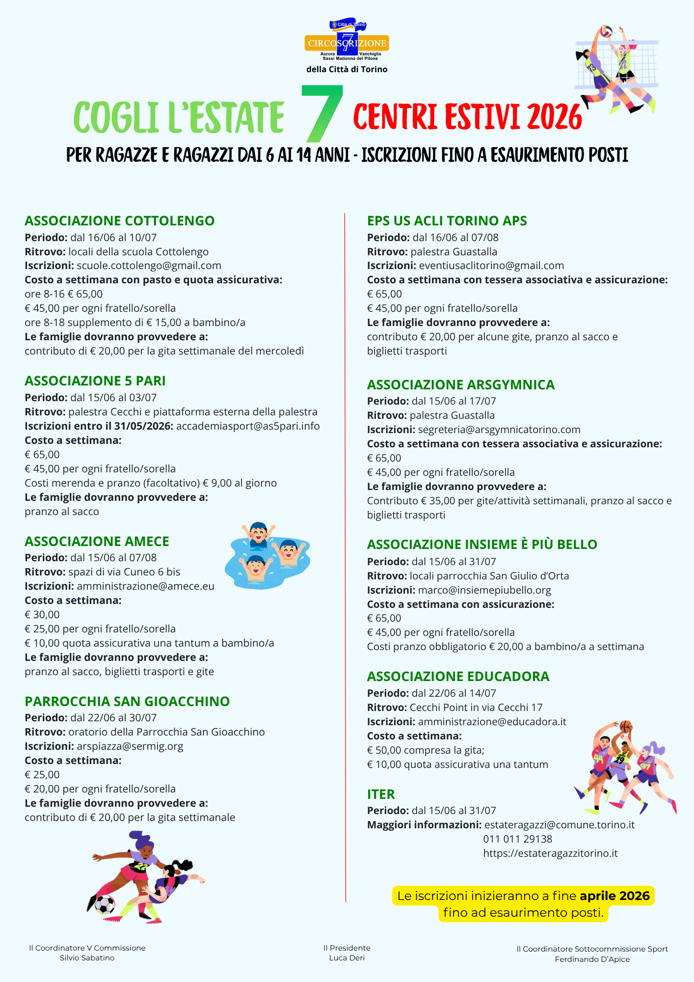Per l’edizione 2026 partecipano 9 realtà del territorio – associazioni, parrocchie e società sportive – che proporranno la versione estiva delle loro attività: esperienze educative, creative e sportive che rappresentano un valore aggiunto fondamentale per la vita sociale dei quartieri e dei borghi della Circoscrizione 7, diversi tra loro ma uniti da una forte identità comunitaria.