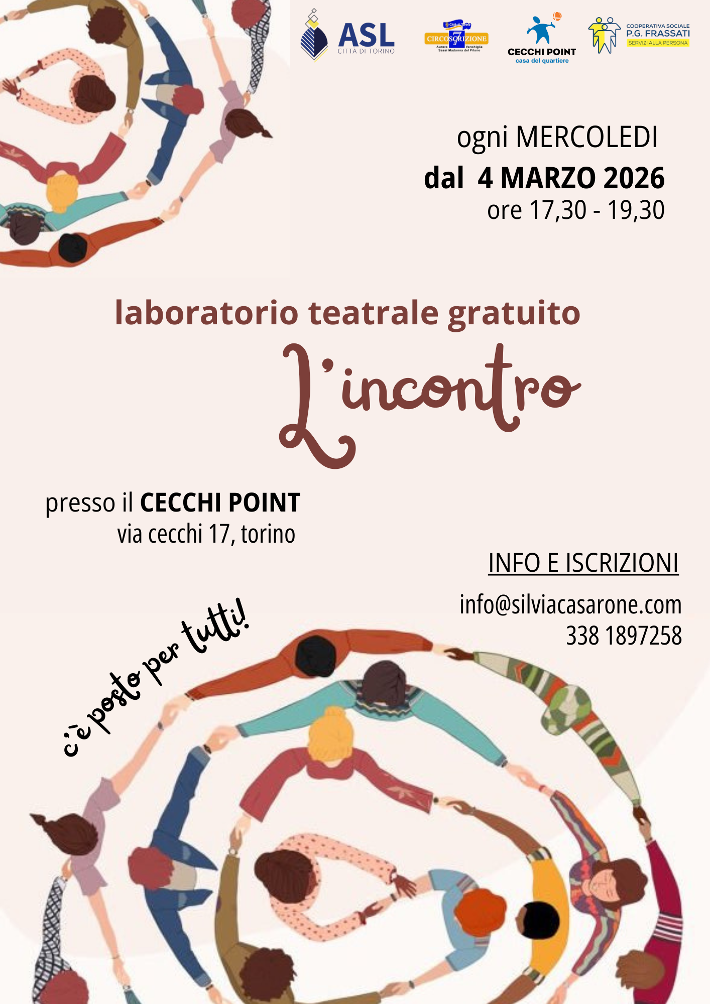 Dal 04 marzo 2026, riparte il laboratorio teatrale gratuito "L'incontro", al Cecchi Point in via Cecchi 17, per chi desidera fare teatro in una dimensione giocosa, leggera, utile e inclusiva.