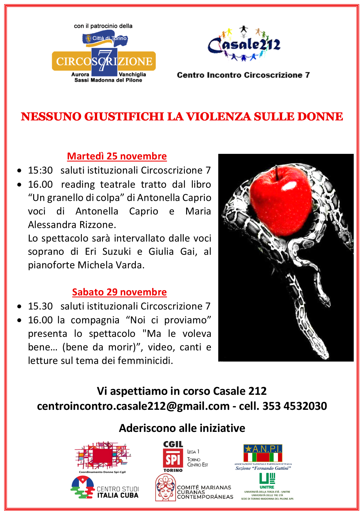 Martedì 25 e sabato 29 novembre 2025 alle ore 16:00, presso il Centro d'Incontro di corso Casale, 212, in occasione della Giornata Internazionale dell'Eliminazione della Violenza Contro le Donne, si terranno due spettacoli teatrali che tratteranno il tema della violenza sulle Donne.
