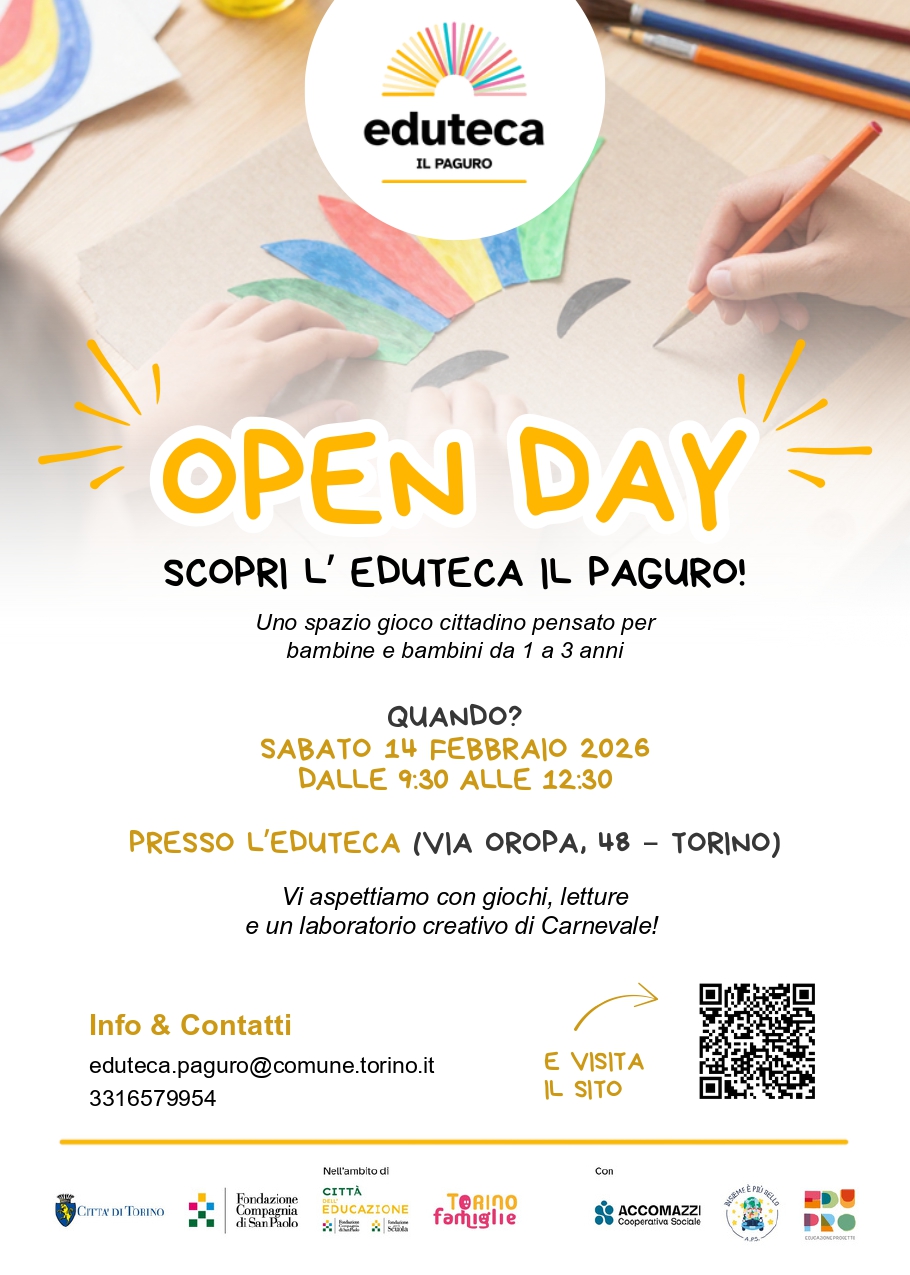 Sabato 14 febbraio 2026 l’Eduteca Il Paguro aprirà le porte per un nuovo Open Day: dalle 9,30 alle 12,30 i bambini e i ragazzi del territorio, insieme con le loro famiglie, potranno scoprire gli spazi e partecipare a laboratori creativi, letture e tantissimi giochi.