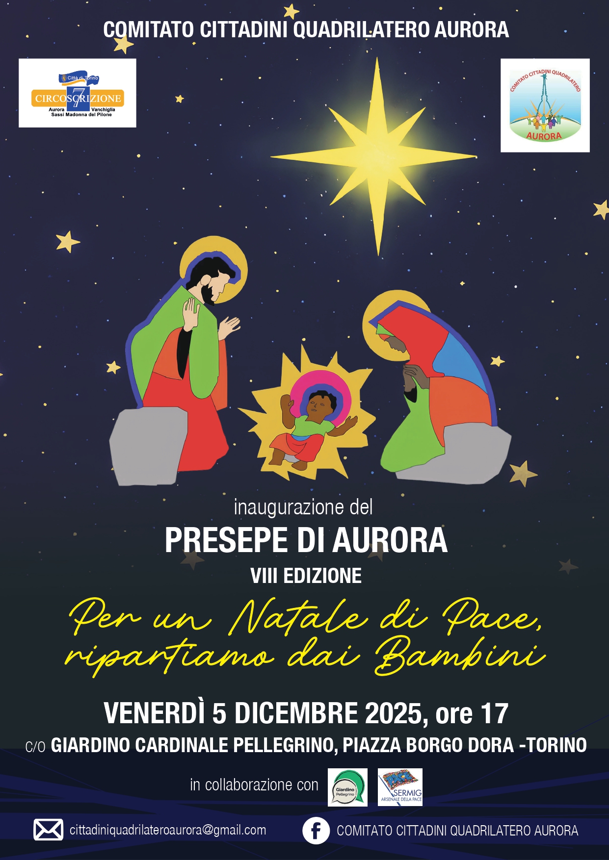 Venerdì 5 dicembre 2025 alle ore 17 presso il Giardino Cardinale Pellegrino in piazza Borgo Dora, il Comitato Cittadini Quadrilatero Aurora inaugurerà il "Presepe di Aurora" giunto alla sua ottava edizione.