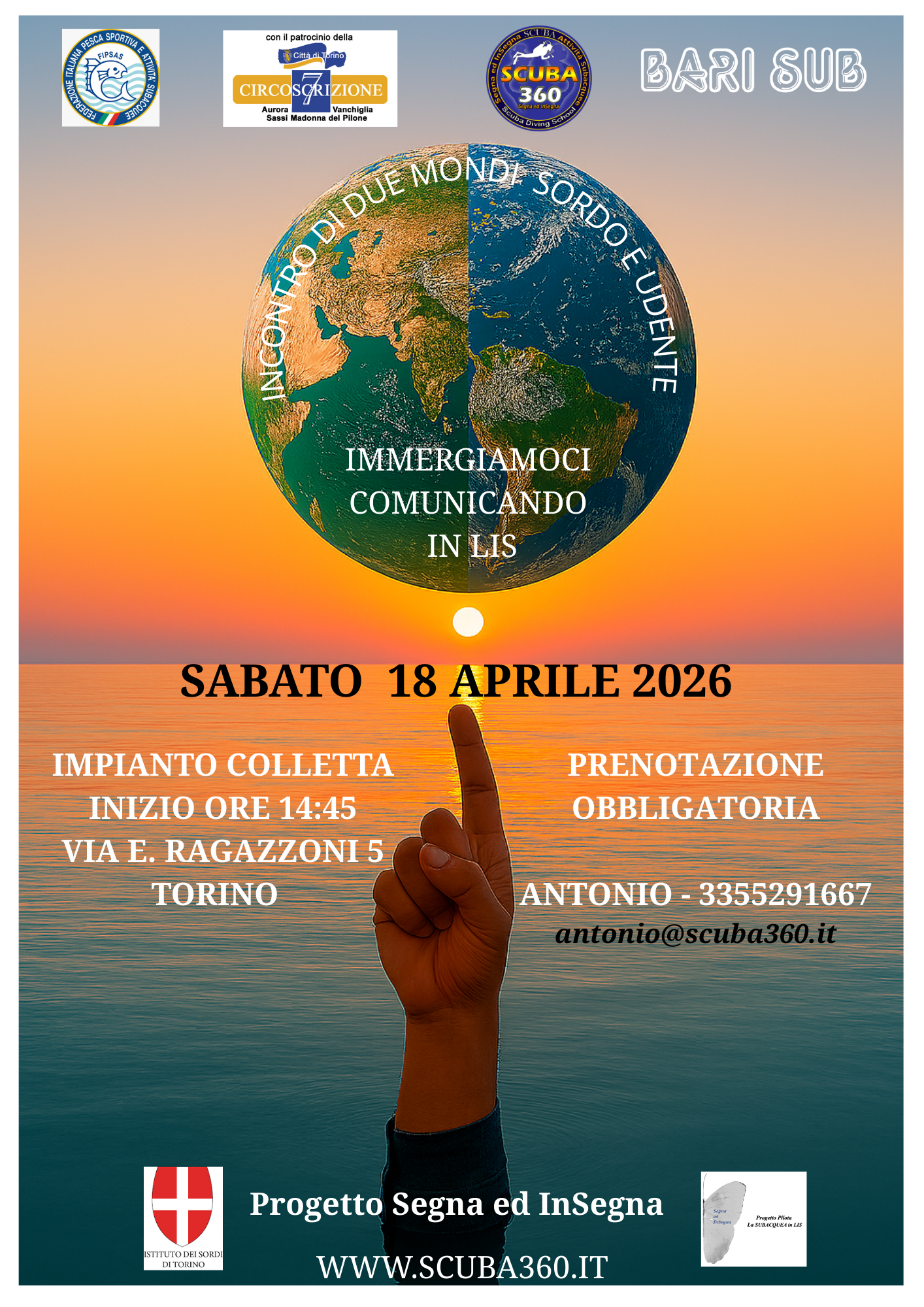 Sabato 18 aprile 2026, alle ore 14:45 presso l'impianto Colletta in via Ernesto Ragazzoni, 5, si terrà un incontro esperienziale dedicato alla comunicazione in immersione tra persone sorde e udenti attraverso la Lingua dei Segni Italiana (LIS), con un focus sulle attività subacquee come strumento di inclusione, relazione e collaborazione.
