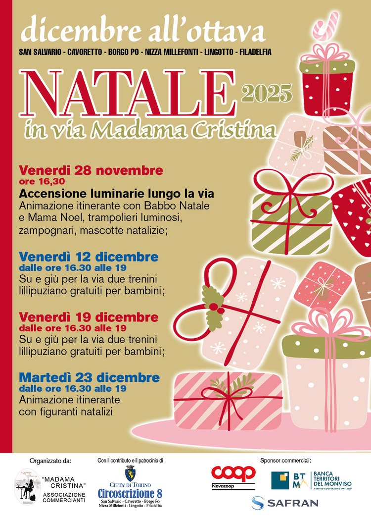 Natale 2025 in via Madama Cristina è un programma di iniziative natalizie con animazioni, accensione delle luminarie, spettacoli e attività gratuite per la cittadinanza, pensate per vivere insieme l’atmosfera delle feste lungo la via. Gli incontri si terranno venerdì 28 novembre alle ore 16:30, venerdì 12 e 18 dicembre dalle ore 16:30 alle 19:00 e martedì 23 dicembre dalle ore 16:30 alle 19:00, in via Madama Cristina. Il progetto è realizzato da Madama Cristina Associazione Commercianti con il contributo della Circoscrizione 8.