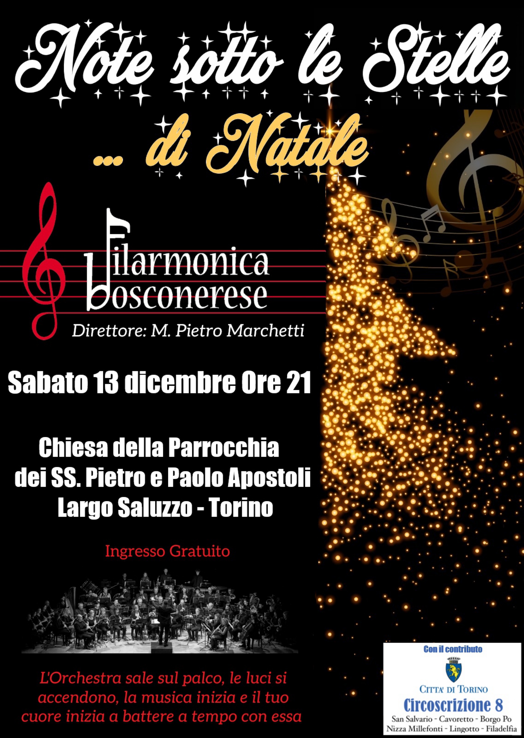 Note sotto le Stelle di Natale è un concerto aperto a tutti, diretto da M. Pietro Marchetti. L’Orchestra sale sul palco, le luci si accendono, la musica inizia e il tuo cuore inizia a battere a tempo con essa. L’evento si terrà il 13 dicembre alle 21:00, presso la Chiesa dei SS. Pietro e Paolo, in Largo Saluzzo, Torino. Il progetto è realizzato con il contributo della Circoscrizione 8, della Città di Torino e in collaborazione con la Filarmonica bosconerese.